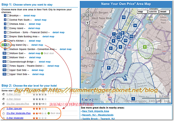 2. 多增加地點:這就是所謂的利用re-bid zone,因為priceline會讓你選擇附近區域,只要你條件有變更,就視同新的投標。因為不是每一個區域都會有我們要求的旅館,比如說我們想標SOHO區4星級以上的旅館,第一次單獨選SOHO區下標100美金結果失敗,這時候若多增加Long Island City這個區域,並不會影響我們的結果,因為這個區域最高只有3星級旅館,如下圖所示,因此priceline在篩選我們選定的SOHO和Long Island City區域中的4星級旅館時,其實也只在SOHO區裡面搜尋而已,但這樣就等於多一次投標的機會了,因此可以馬上再向上出價,不用等一天,而這招若學會,基本上標旅館的招式已經幾乎備齊了。那要怎樣知道哪個區域最高星等的旅館到多少呢?其實很簡單,你只要在一開始的時候在每個區域都試點一下,他都會在下方跳出該區域最高可選星等,反灰無法選的部分就代表該區沒有這個星等的旅館。因此沒有四星級旅館的區域有Coney Island, Long Island City, Madison Square Garden, Queensborough和upper East side,所以你就會多出5個re-bid zone可以標SOHO區的四星級旅館,由於標旅館通常都是挑星級較高的旅館,因為折扣才會大,所以若利用不是每一區都有高星級旅館的技巧,便能有更多機會投標。