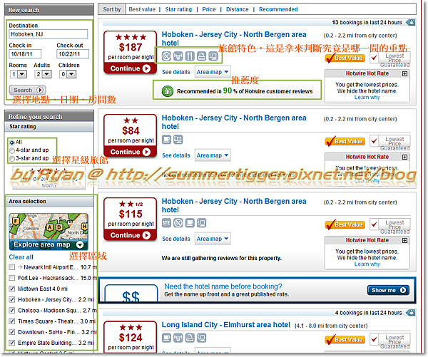 網路上有兩個很重要的參考網站biddingfortravel和betterbidding, 是選擇用priceline或hotwire的人一定要去看的,上面有很多使用priceline得標的金額,可以提供你出價前作參考,而hotwire的資料則是提供旅館特色各是代表哪一間旅館,都是相當實用的資訊,而用這兩種方式標旅館通常可以用一半甚至不到的價格標到很好的旅館,但我認為一般沒有租車的遊客最在意的 "離地鐵站多遠" 並不會先告知,所以有時候區域很大會不小心標到交通不便的地方,對於整個行程會有很大影響。因此要有保握交通沒問題再下標會比較好。而由於區域是固定的,priceline和hotwire網站亦有各自配合的旅館,所以其實透過地區和幾星級的條件,就能篩選出大致上會包含的旅館了。但這邊要注意的是,兩個網站對於區域的劃分並沒有完全一致,舉我這次的例子,原本我是想住四星級旅館在Jersey City的Hoboken,而先前調查priceline發現都是在Path會經過的Hoboken一帶,交通非常方便,結果在hotwire看到價錢不錯就訂下去,但卻跑到北邊的Lincoln Harbor去,這時候才發現原來hotwire的hoboken區域竟然有向北延伸到Lincoln Harbor, 還好交通也OK不至於發生窘境,所以這兩個網站的區域還是有差異的,下訂前一定要再三確認清楚。