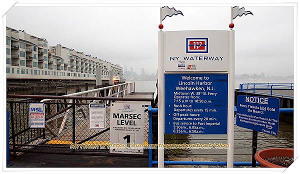 要說這間旅館,得從環境和交通開始說起。因為這裡其實有點與世隔絕,由於附近是辦公大樓,所以這裡的店家幾乎都依附著這些上班族群,甚至就開在大樓裡面,所以附近沒有什麼其他店家,只有一間賣早餐的,和附近大樓裡好像有一間Subway潛艇堡,另外就是飯店對面有一家Ruth's Chris Steak House (茹絲葵牛排)。而交通的話有船有輕軌有公車,看似很多選擇很方便,但其實都很貴。由於旅館旁邊就是Lincoln Harbor, 所以自然有Ferry可以搭到Manhattan, 班次也算密集,但一趟就要9.25 USD, 雖然只要10分鐘不到就能到Pier 11 (38 St. & 11 Av.),但實在太貴所以我們並沒有考慮。