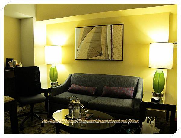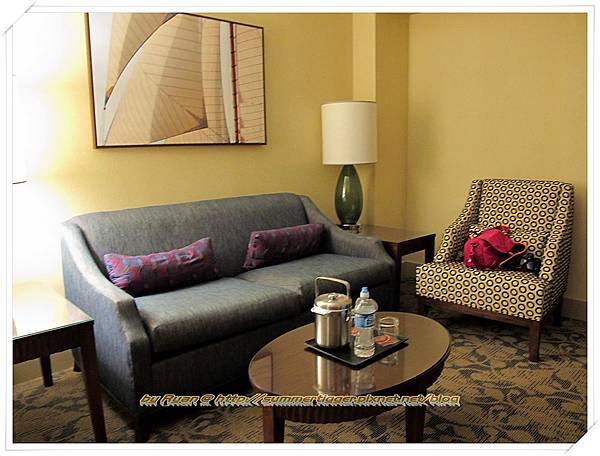 由於在這邊前後共住了三個晚上,睡過兩個房間,基本上房間都是超級大,感覺可以住上五個人都沒問題。房間內都有小客廳和工作桌,而且和床有做空間上的區隔設計。但因為是高級旅館,所以房間內的額外服務都是要收費的,包括想要使用網路得一晚多付9.95 USD,甚至連桌上的礦泉水一瓶都要4 USD, 所以還是單純的享受寬敞的空間和舒適的大床就好囉...