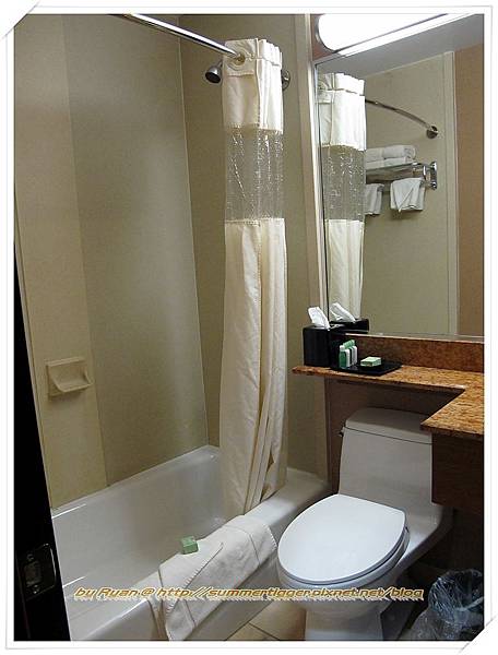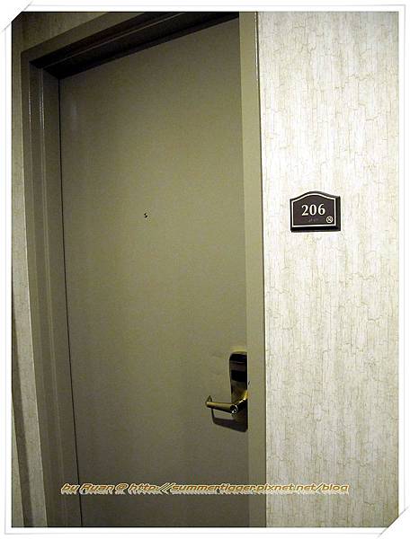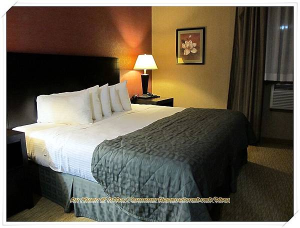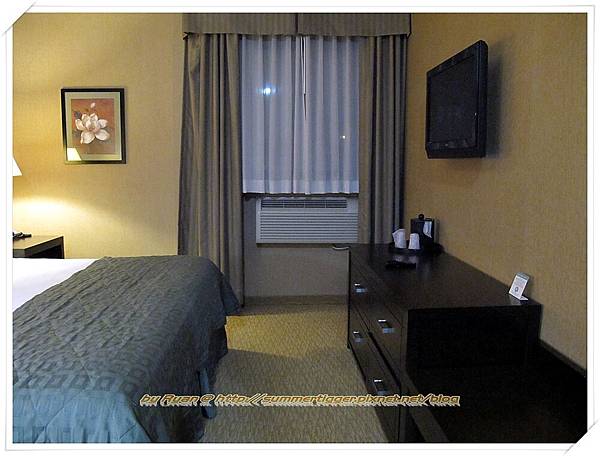 由於我們的房型是最基本的1 King size bed room, 房間內有液晶電視和冰箱,也有免費無線網路可用,而check in時櫃檯會附送兩瓶礦泉水,若是選住Suite,則會有微波爐和按摩浴缸等設備