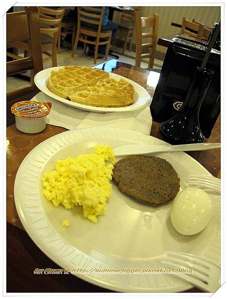 這裡的早餐真的值得一提,雖然是免費的continental breakfast, 但一點也不含糊,有許多熱食包括炒蛋、肉排和水煮蛋,也可以自己做Waffle (鬆餅),而且還滿好吃的,論早餐的話,這裡比我們第一天住的Best Western系列好,尤其是這裡有熱食