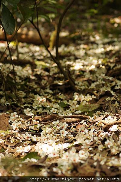 往兩旁山林間望去,可見滿地桐花