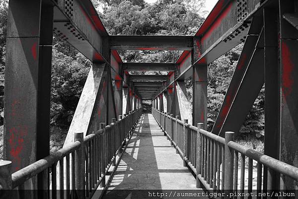 紅橋怎麼會褪色成這樣? 其實是相機的色彩濾鏡功能啦,一直不知道這座橋為何會用鋼骨蓋得如此慎重,莫非是過去有極大的交通價值? 因為現在似乎這一帶除了登山遊客外,鮮少人會走這裡