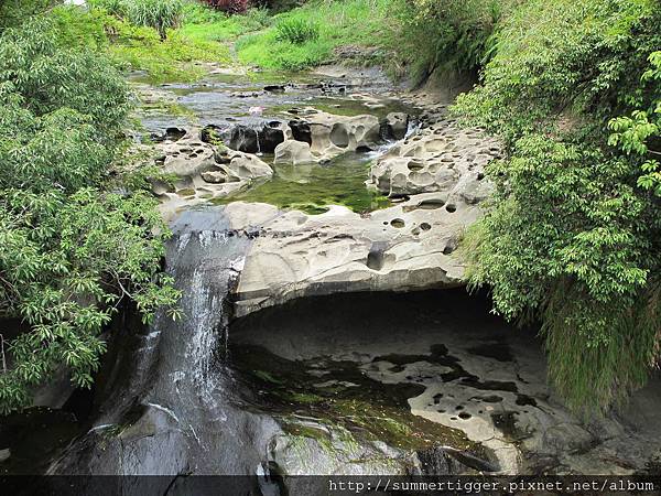 這是離開園區後前往十分車站時看到的眼鏡洞瀑布,比起在十分瀑布園區內更近了些,這邊也可以看見特有的壺穴地形