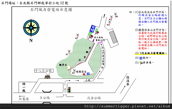 關於要如何抵達石門風力發電廠,台電官網上有很詳細的地圖如下,基本上是走淡金公路,從台北來的方向就是在到王公橋的紅綠燈前右轉進入,若從野柳方向來的則在過十八王公廟後要左轉,之後右轉上坡就可以抵達了