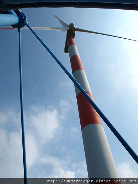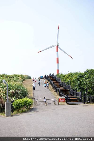 步道很短,在終點涼亭處可以抬頭仰望風車,老實說還滿嚇人的,因為轉的速度遠看不怎樣,近看到是很驚人,加上轉動的聲音,讓我直覺聯想到刺激的遊樂設施,像這樣高速旋轉一想到就腿軟!