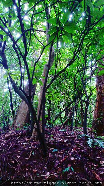 先往次生林相觀察區,所謂次生是指原始林經人為開發或災難後所形成的裸露地,通常會先由喜好陽光的植物如芒草、血桐、構樹、山黃麻等開始成長為森林,這樣的森林就稱為次生林。而次生林裡最先長出來的先鋒植物因為需要大量的陽光,所以又稱作陽性植物。能夠看到這樣的景象,一定要長時間無人為破壞,才能自然孕育出如此的次生林。