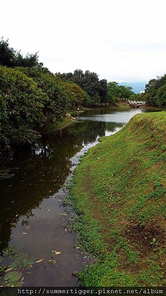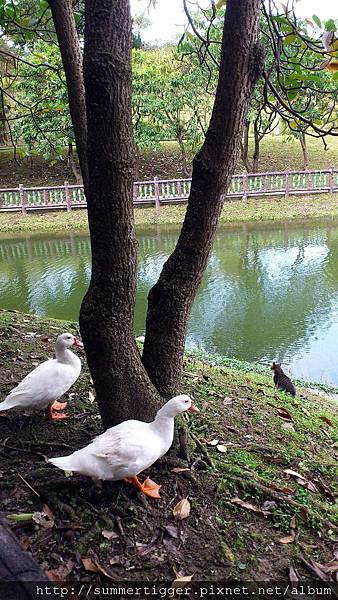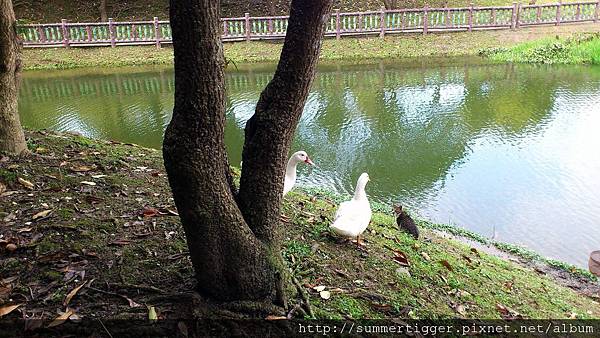 公園內埤塘附近有特定區域可以釣魚,其他區域則禁止釣魚,我是不知道這種互相連通的埤塘,在特定區域釣魚的用意在哪? 這些水不是都相通嗎? 難道魚就不會游動過去嗎? 還是說希望釣魚的面積不要太大,以免影響當地生態? 不過我在可釣魚的區域看到貓和鵝的奇異組合,但這應該都是有人養的吧,捕捉到兩隻鵝戲弄貓的畫面,首先兩隻鵝先從樹後面緩緩接近貓,貓還在望向池水沒有發現...