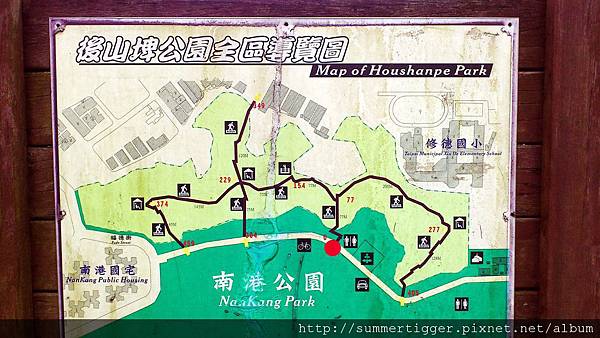 首先是20日中午的行程,本日重點是南港公園一遊加上探路,從昆陽站的昆陽街一路走進來,會遇到南港公園的大牌樓,我沒有選擇從此進入,而是繼續向前行走到停車場的柏油路才左轉進入公園,原因無他,因為親山步道的指標是從這轉入,但其實步道入口不是在公園裡,而是要穿過公園,從這走是比較快的捷徑,而進公園後會看到舊有的地圖導覽,這裡可以看到以前還稱作後山埤公園,和南港公園是相鄰的,由於後山埤公園地勢較高,也有幾條很簡易的木棧步道可以走,所以儘管幾乎都是小丘陵地形,但由於步道完善,走起來還是很輕鬆