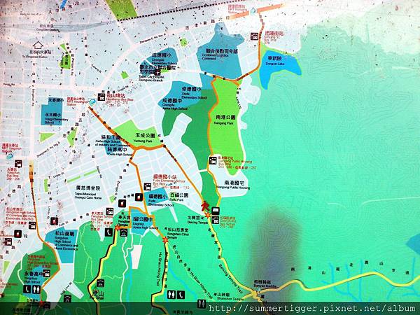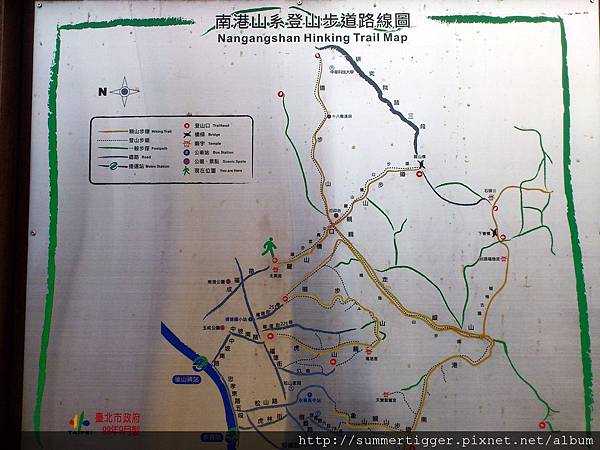 南港原本是一個平常不會來的地方,但因為工作換到南港後,久了就比較熟這裡的環境,尤其每天上班從昆陽捷運站出來後都會看到麗山橋口親山步道的指標,但距離有一公里遠,讓我覺得搭捷運來的人一定都是用走路的,這麼遠的指標真的會讓人一點動力都沒有,只是看久了也逐漸讓我好奇究竟麗山橋口親山步道在哪? 雖然工作的地方就可以看到山了,但不確定究竟登山口在何處,正好這幾天天氣轉晴,中午休息時間不禁讓我興起偷閒去走走的念頭,查了一下地圖和方向,其實不遠,路程一小時左右來回應該不成問題,因此就決定到山上野餐了,以下都是我完全用步行的方式完成的,我想若有騎車或開車來上班的話,我一定能走完整條麗山橋口登山步道,而因為光是用走的到登山口就要快30分鐘了,所以我只能走完前半段的北興宮步道,後半段的麗山橋口步道的部分則沒有走,下次有機會會再完成。而這段行程是分兩天來走的,第一天我只造訪了南港公園,並探了一下往北興宮的路而已,基本上南港公園也是一個很值得一遊的公園,其天然的埤塘更是一般多用人工埤塘的公園所不能比的,現在的南港公園是結合了原本的南港公園和後山埤公園,結合成一個大型公園,不過園內仍然可以看見後山埤公園的地圖,兩個公園其實很好分辨,後山埤公園是山坡丘陵地形為主,南港公園則是埤塘平地為主,但現在兩公園結合因此沒有清楚的分界點。