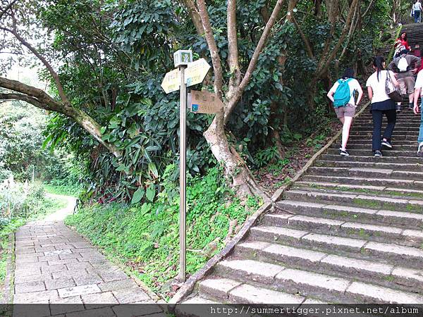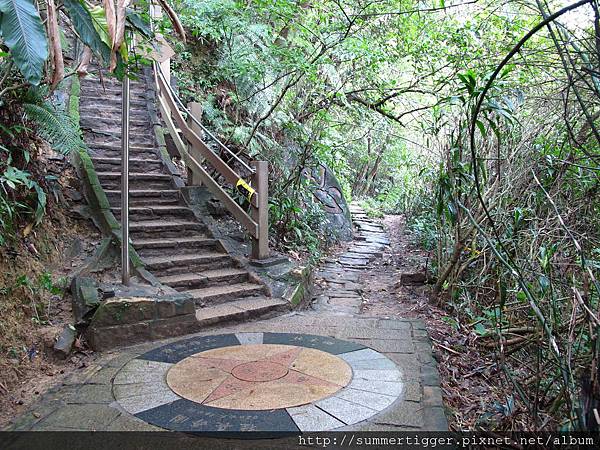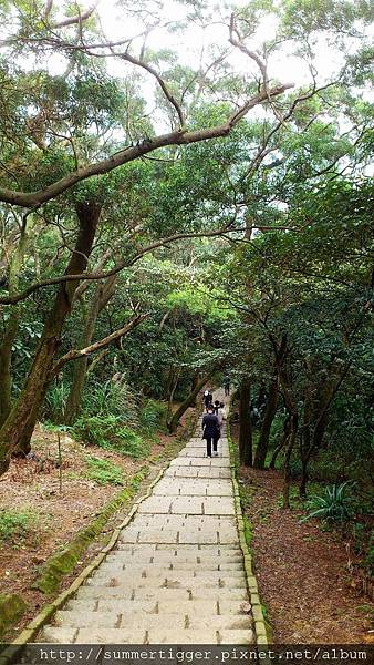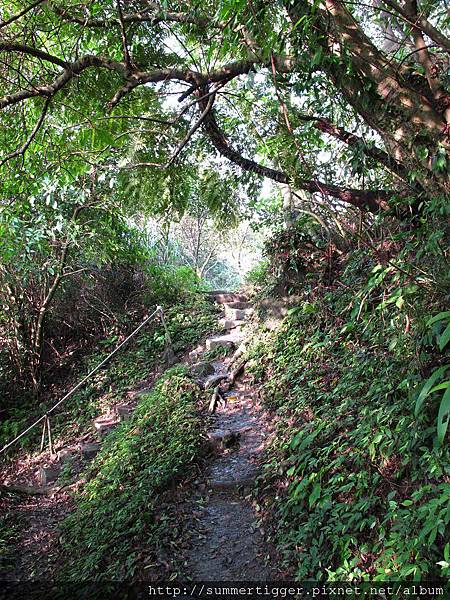 往拇指山和九五峰的方向得往上爬,基本上若是要走親山步道主線的話,沿著大路石階步道走就對了,沿途小徑不少但都可以忽略,當然這些小徑都是比較質樸的路徑,也包含了之後的攀岩路線