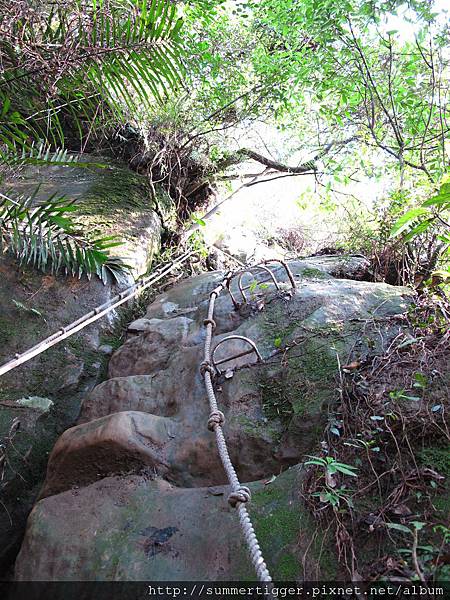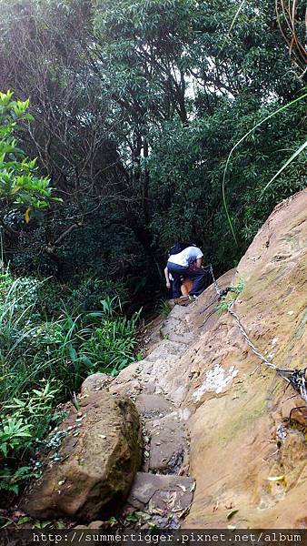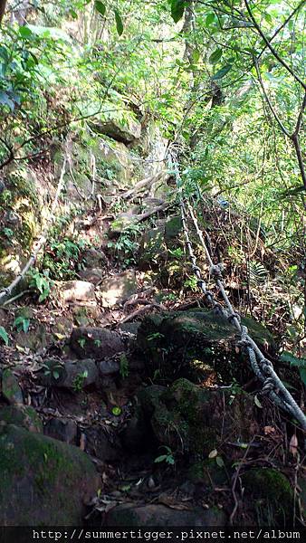 回程時在一處要陡上的石階右邊,有人走出來,經詢問才知道從這個小徑走會接到南港山攀岩路線,這時心想那就試試看吧,這是走進來後往回拍的,我們是走進來後直走,並沒有直接往右切下去 (圖上有繩索處),而那處就是南港山攀岩系列的四號攀岩路線,難易度算是最簡單的,而由於是額外行程,雖然我知道這邊有攀岩路線,但出發前並沒有研究這部分,所以是回家後查詢Tony網站才知道我們走的是第五號攀岩路線,難易度是南港山攀岩五條路線裡算中等的