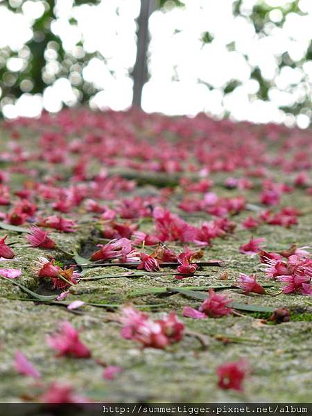 休息的石椅上片鋪著凋謝的櫻花瓣