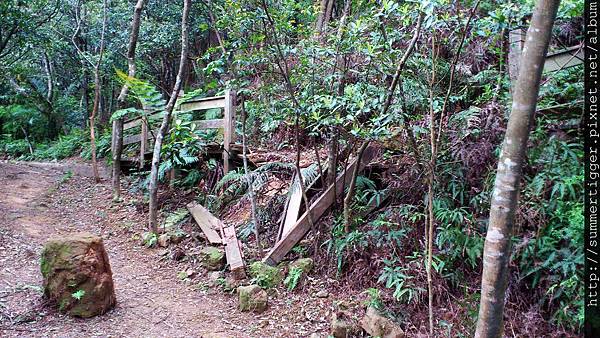 答案揭曉,眼前一顆岩石躺在路中央,雖稱不上巨石,但足以打壞原本的木棧階梯了