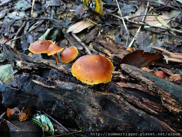 橫躺在地面的枯樹枝上也長滿了蕈菇