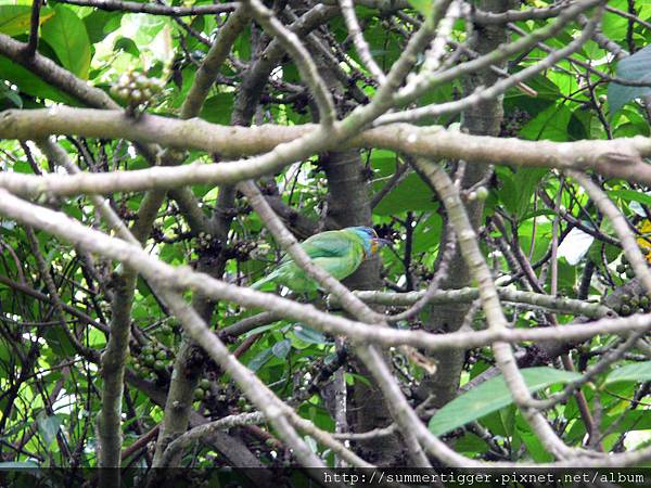 古道上出現一隻五色鳥,綠色身體藍色脖子,這種鳥在都市有人養