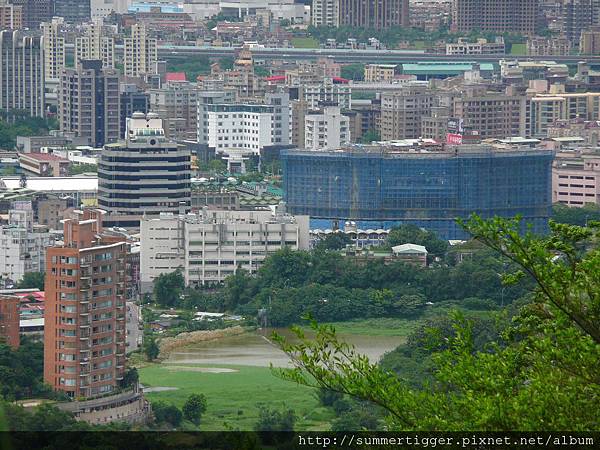 10倍變焦望遠果然超好用,可以清楚的眺望新庄仔埤 (東新埤),後方藍色正在蓋的建築為TFDA大樓