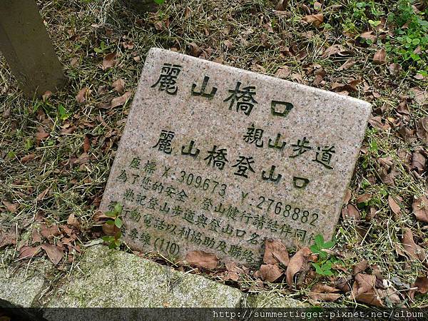 出口處有麗山橋口親山步道--麗山橋登山口的石牌