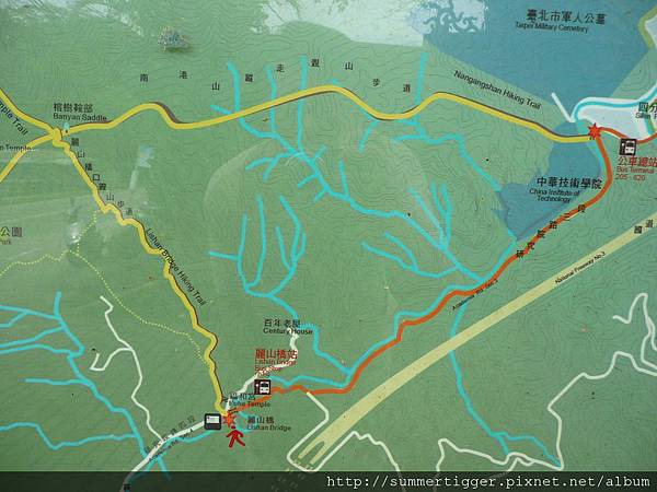 交通: 從南港來的話走研究院路,到三段處的時後會看到中華技術學院,前面有一片機車停車場,旁邊是台北市軍人公墓,而登山口處就在往中華技術學院(現改名為中華科技大學)旁的巷子走進去左轉,很快就會看到右邊有登山口階梯往上 (階梯口在土地銀行的對面)